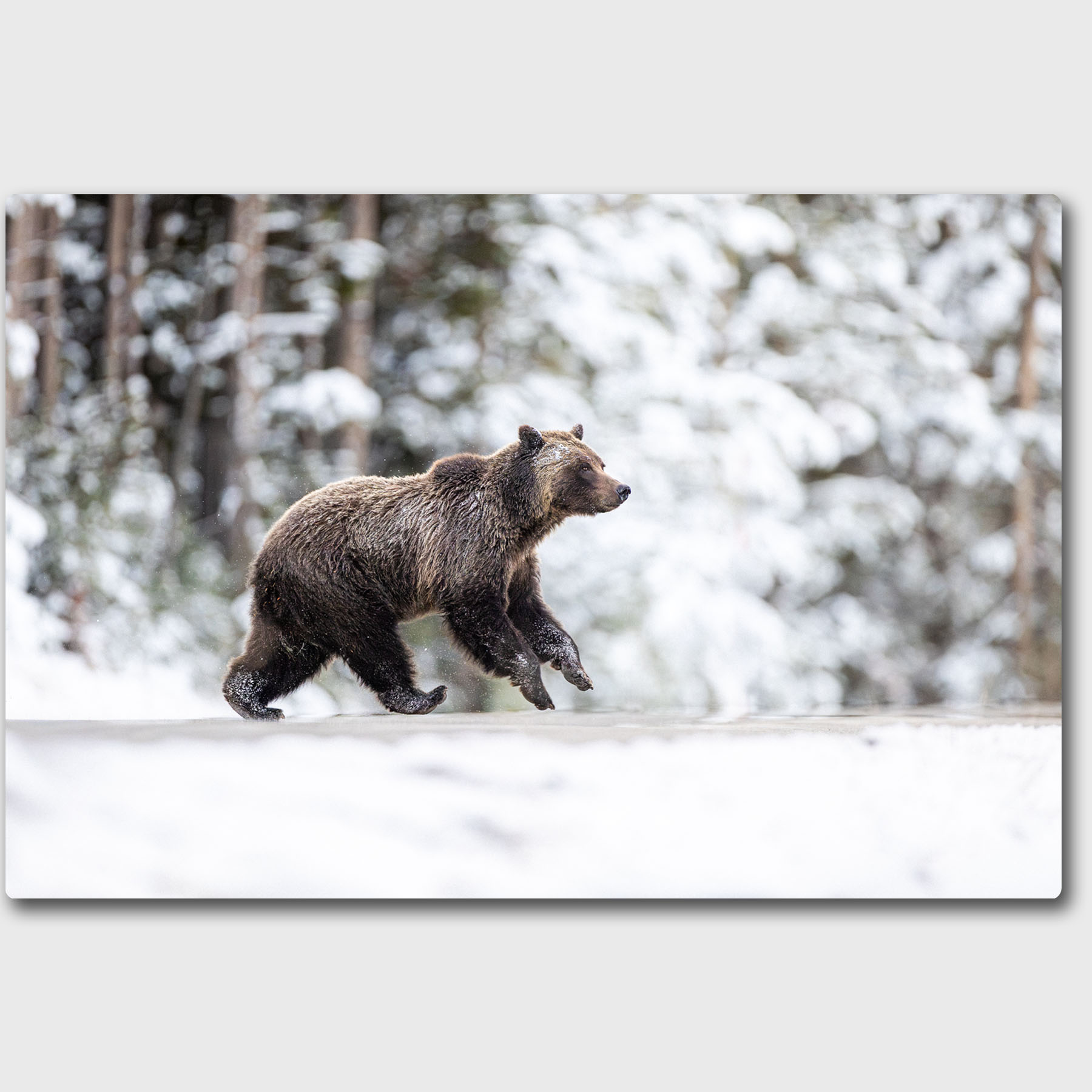 Every fall, we inevitably get hit with a good snowstorm early enough that the bears are still awake. And while this is very normal and realistically this bear probably didn’t get around to hibernating for another few weeks after this, it’s fun to imagine that he woke up to a fresh snowfall and is running to his den because he forgot he was supposed to be hibernating! I actually took this photo mere moments after capturing this frosty shot of wolf 1267F. As I drove away from the wolf sighting, I went around the bend and spotted this grizzly coming out of the woods toward the road. As he approached the road, he got spooked and made a beeline for it as more cars started to show up. I just barely had enough time to duck into the ditch next to this road and capture this eye-level frame as he bolted across the road!